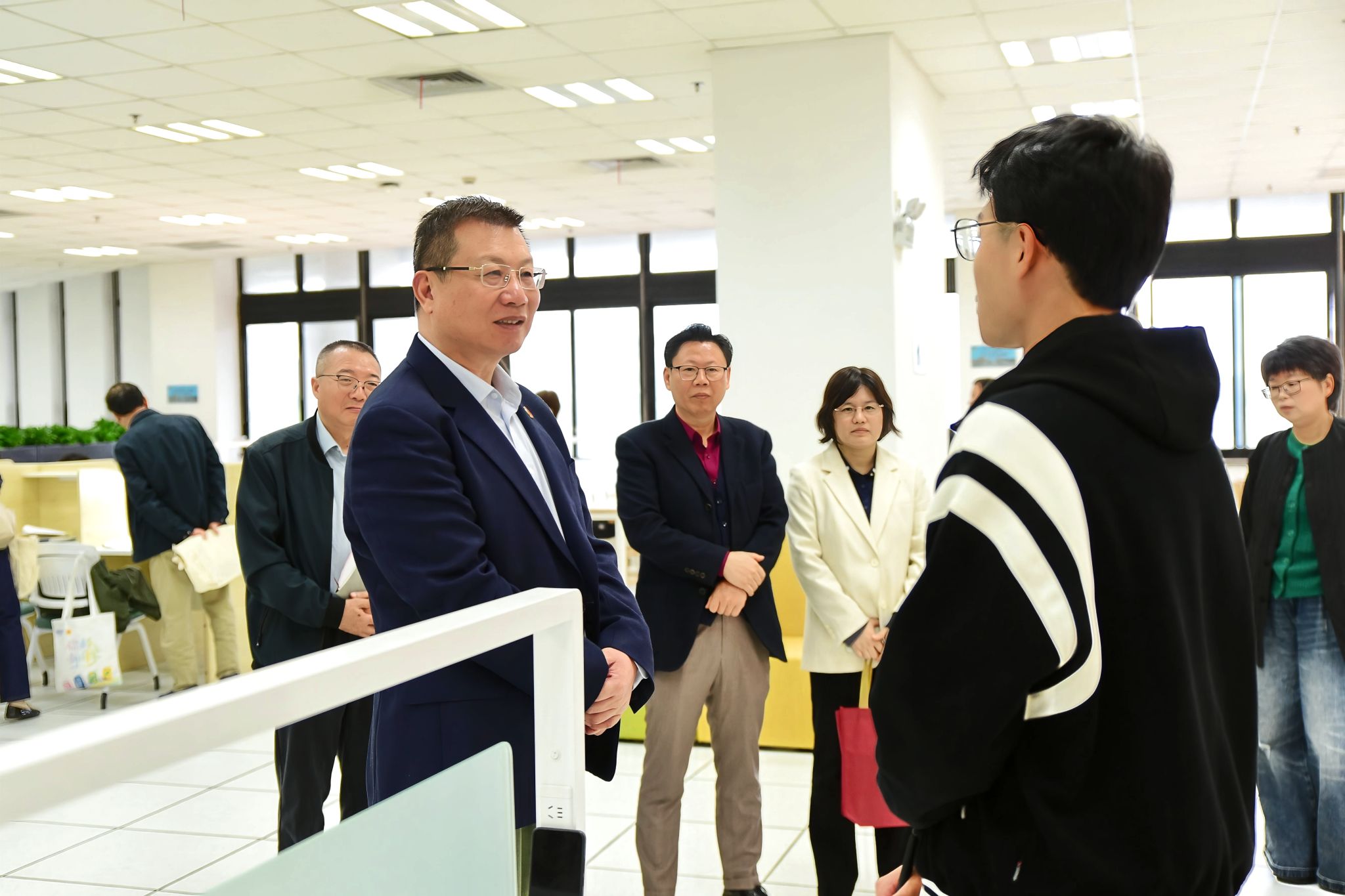 11月7日下午,校长汪小帆到图书馆阅览室调研,对阅览室改造后的整体环境和使用情况进行了实地视察。汪小帆详细查看了空间划分、桌椅设施和地板铺设等情况,并现场与自习学生亲切交流,详细询问了学生对阅览室改造环境的意见和建议,鼓励同学充分利用图书馆的良好环境和资源,扎实学好专业知识。