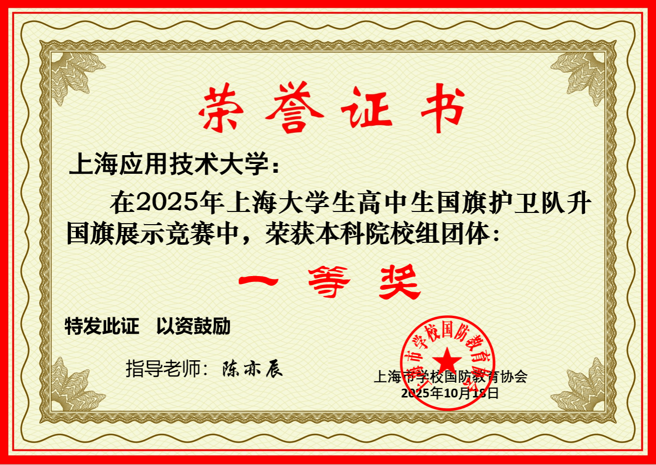 10月18日,2025年“青春旗帜——向祖国致敬”上海大学生高中生国旗护卫队升国旗展示活动在华东理工大学附属闵行科技高级中学举行。来自全市多所高校与中学的国旗护卫队汇聚一堂,以规范的仪式、昂扬的精神风貌向祖国献礼。上海应用技术大学代表队在激烈角逐中脱颖而出,荣获高等教育混编组团体一等奖。