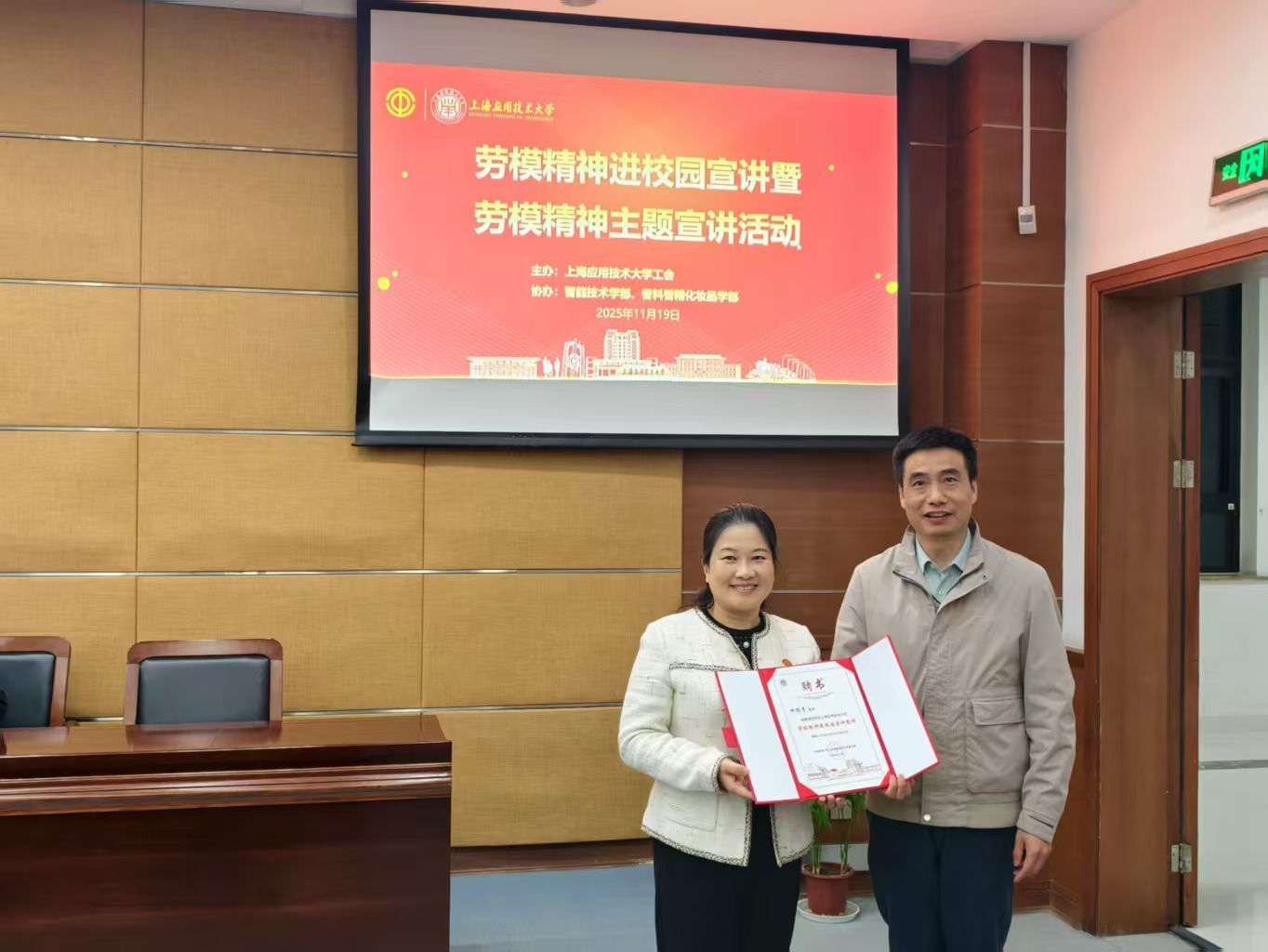 为进一步发挥劳模先进榜样示范引领作用,大力弘扬劳模精神、劳动精神,11月19日晚,由校工会主办,智能技术学部和香化学部协办,虎扑nba“劳模精神进校园”主题宣讲活动举行,特邀我校上海市劳模田怀香教授为全校师生作主题宣讲。校工会为田怀香教授颁发“劳模精神进校园”宣讲教师聘书。