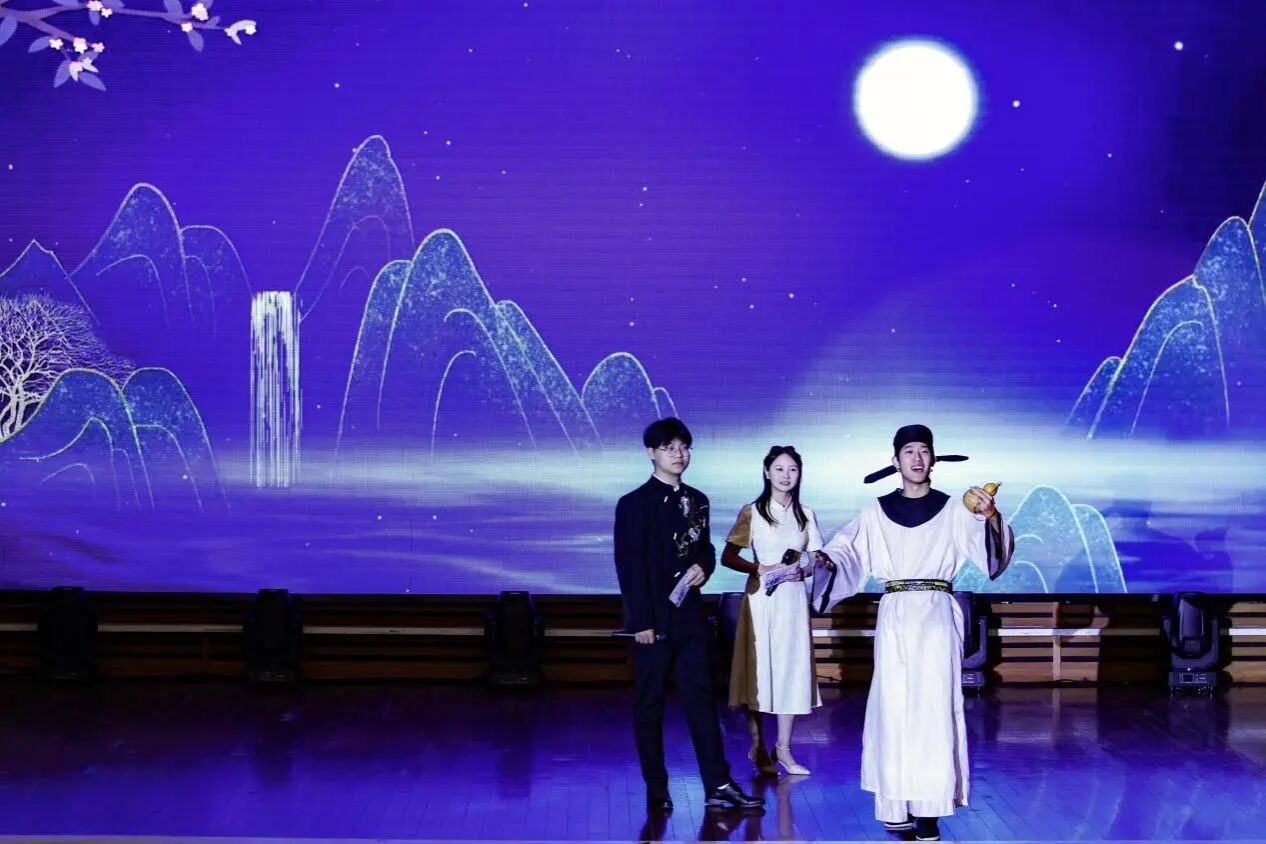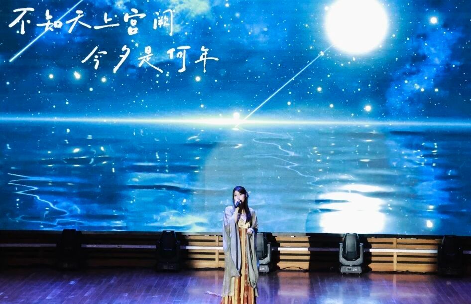 情景互动短剧《月下奇遇》中,在轻柔古筝曲中,身着唐装、手持酒壶的“李白”踏月而来,与上应学子展开了一场关于“月亮、科学与梦想”的跨越千年的对话。