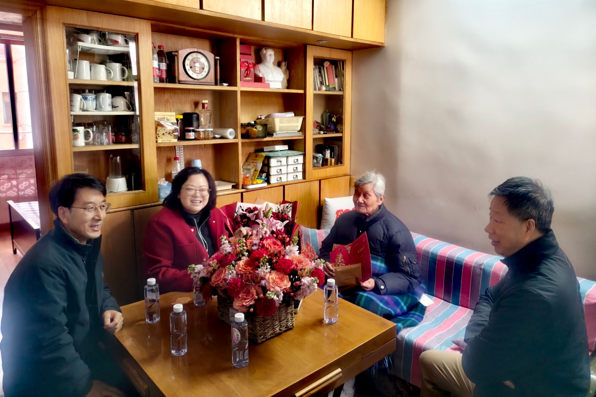 张家科、田永杰分别代表市委老干部局、市教卫工作党委老干部处赠送了鲜花和慰问品。张家科深情表示,离休干部是党和国家的宝贵财富,为党和国家的事业作出了不可磨灭的贡献。他通过手写板向林老祝福“新年愉快!身体健康,明年再来给您祝寿!”。田永杰详细询问了林老的日常护理情况,叮嘱老同志要保重身体,保持乐观心态,安享幸福晚年。