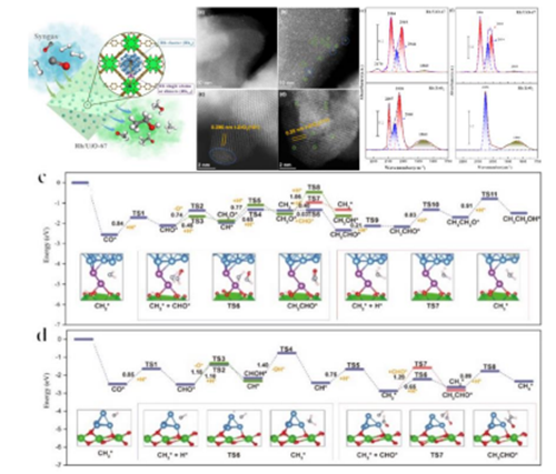 合成气(CO+H2)催化转化为乙醇为主的碳二及以上(C2+)含氧化合物是非石油资源清洁高效利用的重要途径之一,可保证能源和化工原料来源的多样化。本工作以Zr基金属有机框架材料UiO-67为载体封装单金属Rh,在UiO-67空间限域效应和配位不饱和Zr金属节点的双重作用下,封装于UiO-67孔笼中的Rh催化剂(Rh/UiO-67)在邻域空间内形成了动态稳定的Rh单/双原子-团簇组合体(Rh1,2-Rhn)双位点活性结构。在300 oC和3 MPa反应条件下,Rh/UiO-67的CO转化率达到了50.4%,含氧化合物选择性高达72.0%;首次获得了突破25%的C2+含氧化合物的单程收率,超越了已报道的所有Rh基催化剂,且反应性能稳定。