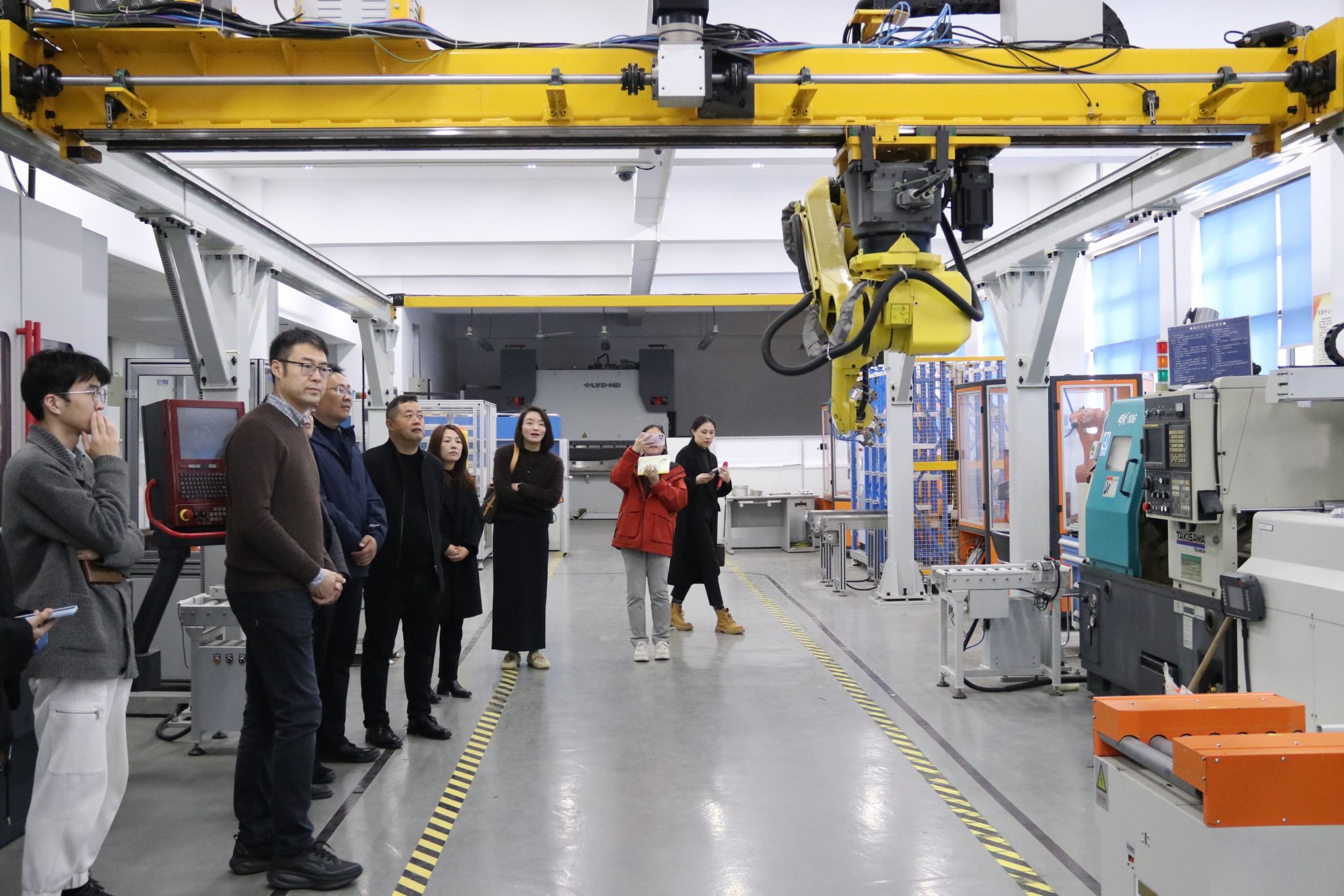 会前,南桥镇与上海交通大学国家大学科技园一行参观了智能制造实验室。智能制造系主任逯代兴向参观嘉宾们展示了实验室的智能仓库系统、学生实训的数控机床与机器人。
