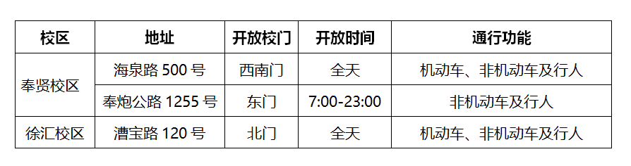 7月10日零时起,奉贤校区、徐汇校区由指定校门进出,其他校门关闭(详见下表)。