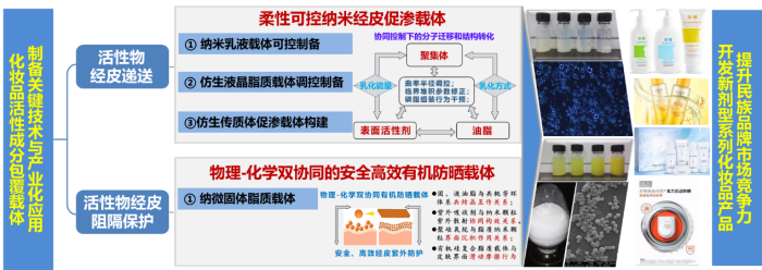 该项目积累18年来的科研成果,基于化妆品活性成分的作用机制及理化性质,针对性构建载体结构,并通过精准递送以提升其生物活性。以包覆神经酰胺仿生传质体为核心技术,与上海麦坤特医药科技有限公司合作,通过提升婴幼儿皮肤修护成分生物活性,开发出了国内首个针对婴幼儿特应性皮炎(AD)的“纽强”系列皮肤修护产品。以包覆光甘草定纳米脂质载体技术,与无限极(中国)有限公司合作开发了祛斑系列化妆品,具备高度安全及优异的祛斑功效;以包覆防晒剂固体脂质微粒载体,构建了O/W/O多重乳化新剂型高防晒指数系列产品,相较于国外大品牌防晒化妆品,在较低防晒剂含量下,具备高效防晒性能与高度安全性。