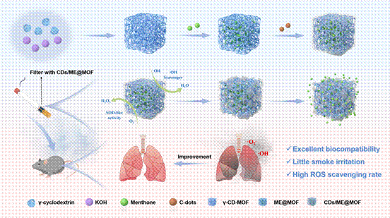 卷烟点燃后烟雾会释放出高水平的活性氧和活性氮,自由基过量会介导氧化防御系统和抗氧化防御系统之间的失衡,进一步导致细胞功能障碍和死亡,并且卷烟在生产和加工过程中会产生刺激性气味,影响卷烟的质量。基于此,团队在具有良好生物相容性的γ-环糊精基金属-有机框架中引入具有自由基清除活性的碳点纳米酶和改善香气的薄荷酮,从而开发了一种新型的烟雾净化器(CDs/ME@MOF),以减少香烟烟雾中的气味刺激、降低烟雾引起的肺毒性。