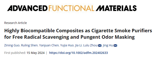 近日,我校香料香精化妆品学部在卷烟加香减害方面取得突破,于材料领域权威期刊Advanced Functional Materials(材料科学1区Top期刊,IF=19)发表题为“ Highly Biocompatible Composites as Cigarette Smoke Purifiers for Free Radical Scavenging and Pungent Odor Masking ” 论文第一单位为上海应用技术大学,我校胡静教授、周露露博士为共同通讯作者,我校香料香精化妆品学部硕士研究生郭子宁为论文第一作者。