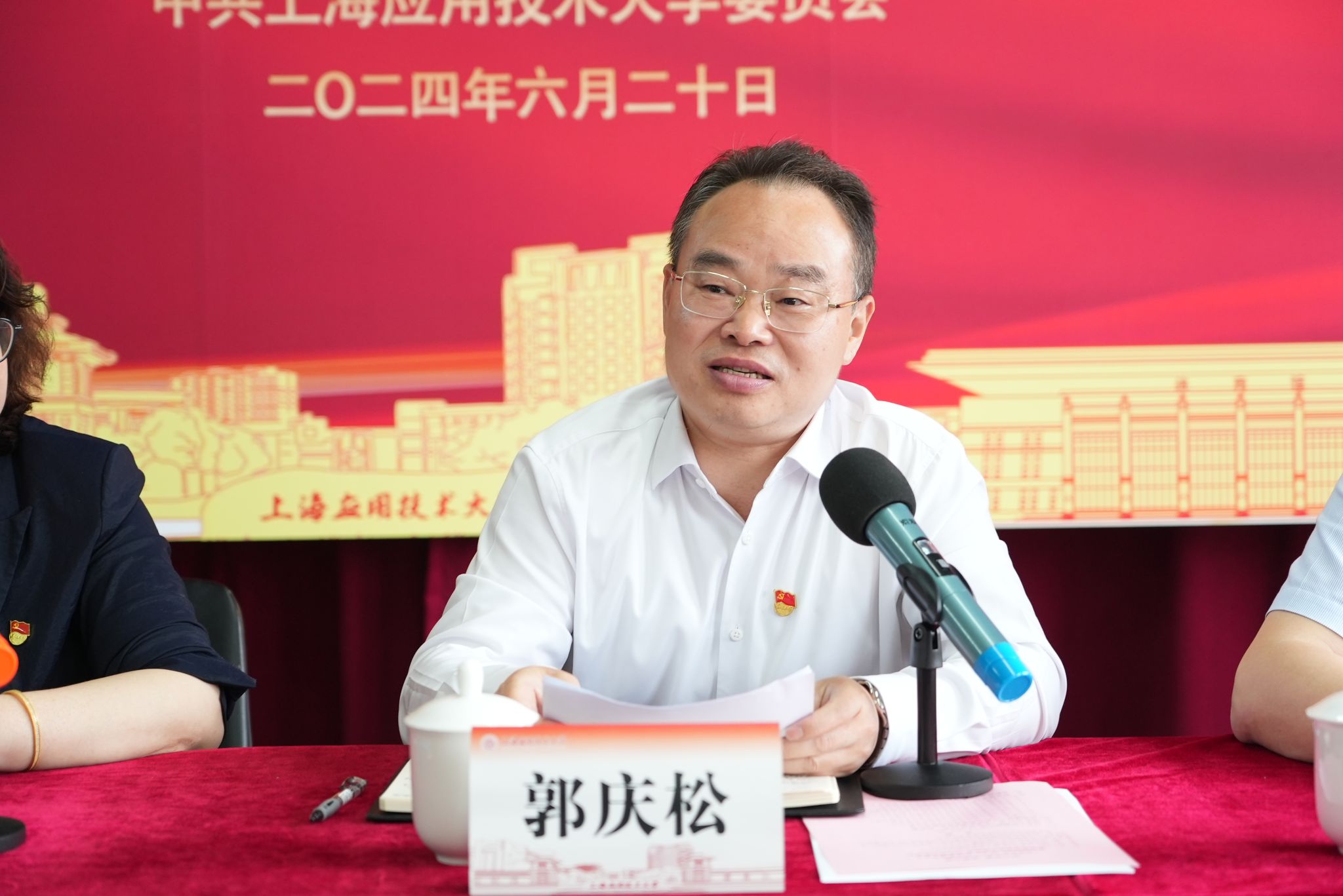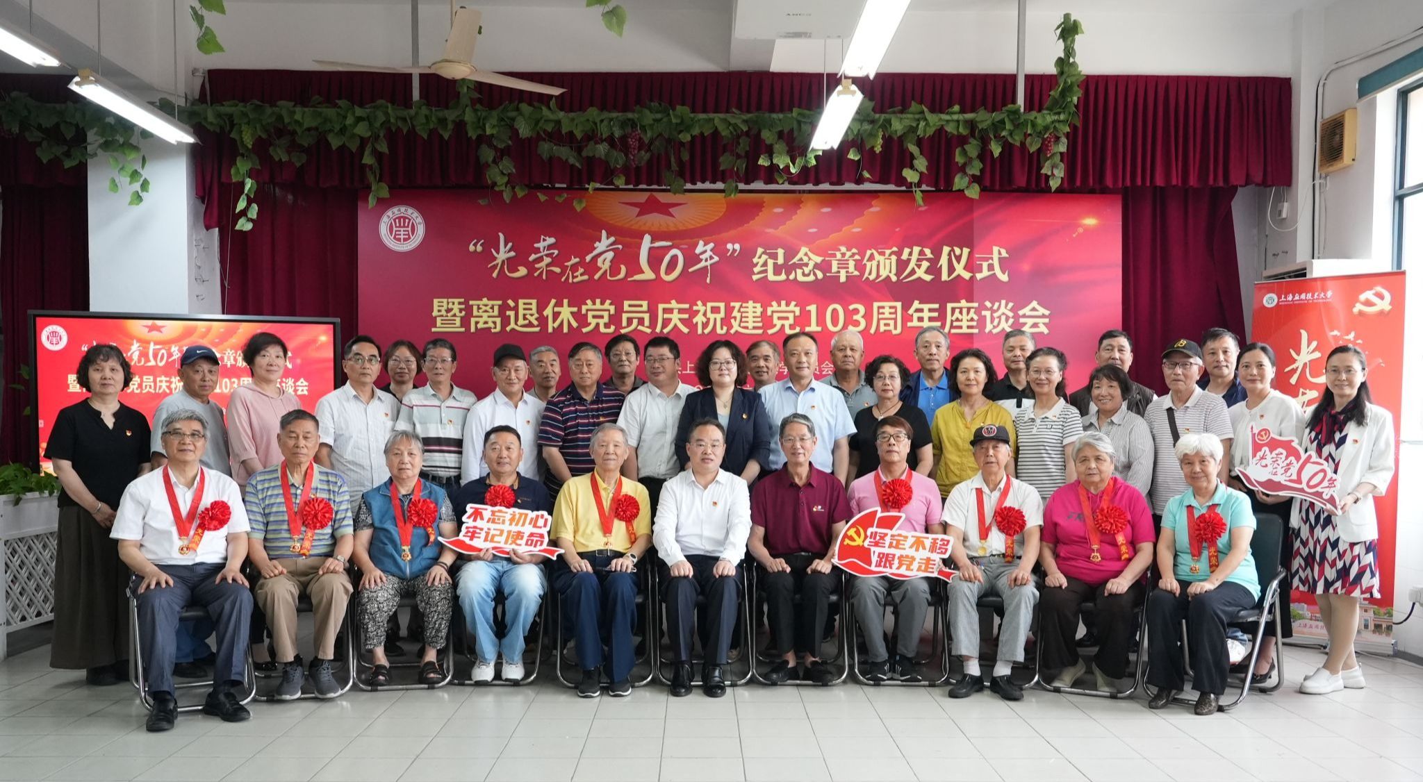 6月20日,“初心如磐 弦歌不辍” ——“光荣在党50年”纪念章颁发仪式暨离退休党员庆祝建党103周年座谈会在徐汇校区举行。校党委书记郭庆松出席并讲话,校党委副书记陈海瑾主持会议。校党委常委、党委宣传部部长杨明,校党委常委、组织部统战部部长王占勇出席,“光荣在党50年”党员代表、校离退委班子成员、离退休党务骨干代表参加。