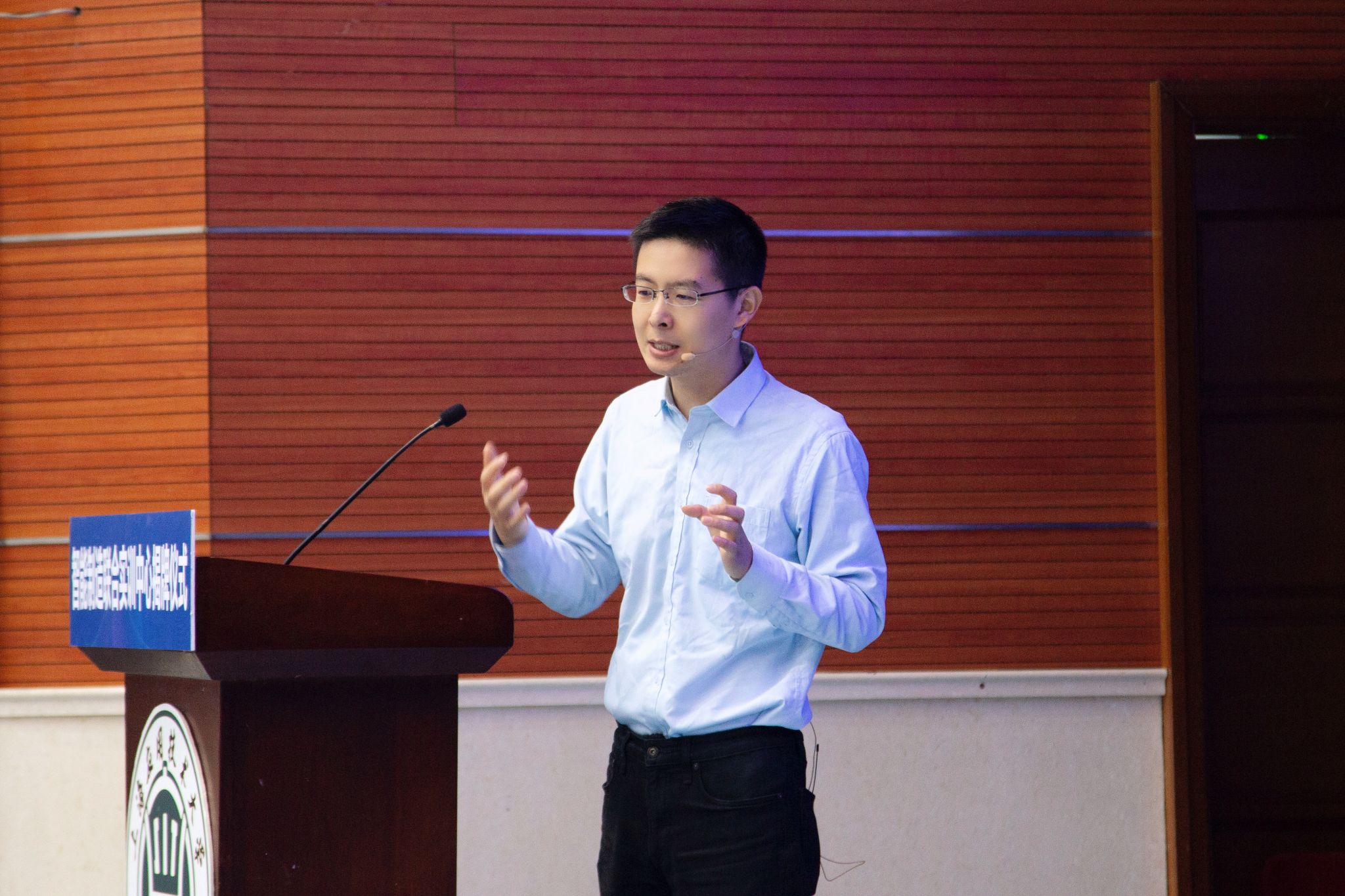 揭牌与聘任仪式后,王兴兴的主题演讲与人形机器人创新演示点燃全场热情。此时的图书馆 B106 会场座无虚席,连走道也站满了慕名而来的学生。王兴兴以自身成长与创业经历为蓝本,分享了对技术、梦想与成长的思考。