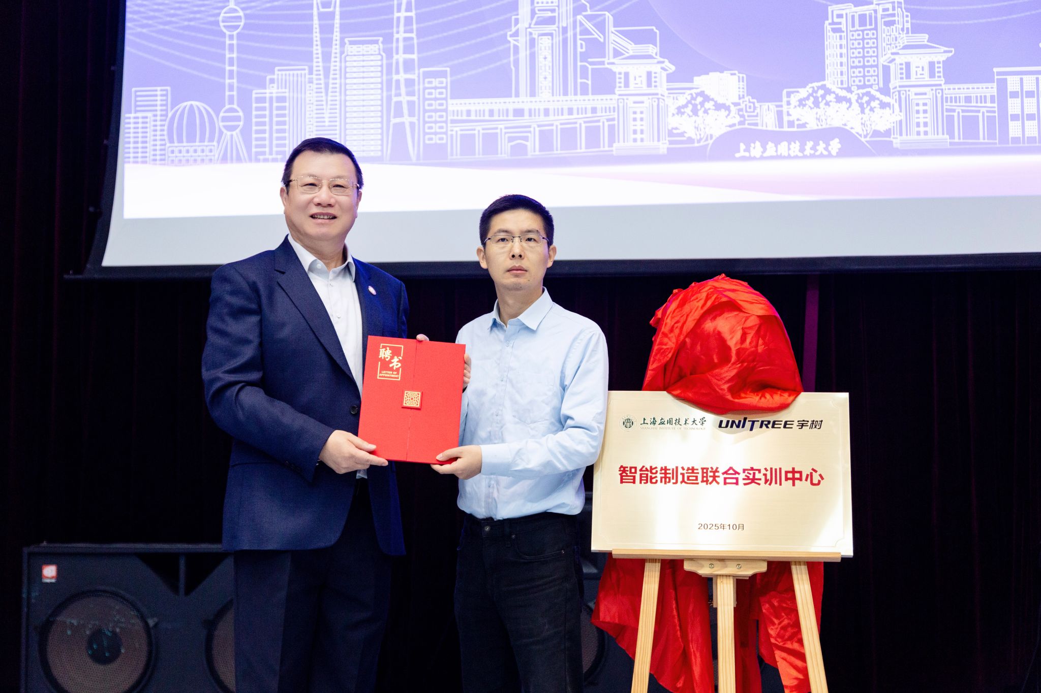 签约后,双方共同为“上应大-宇树科技智能制造联合实训中心”揭牌,王兴兴受聘为联合实训中心名誉主任,宇树科技股份有限公司运营总监邓晟受聘为兼职产业导师。