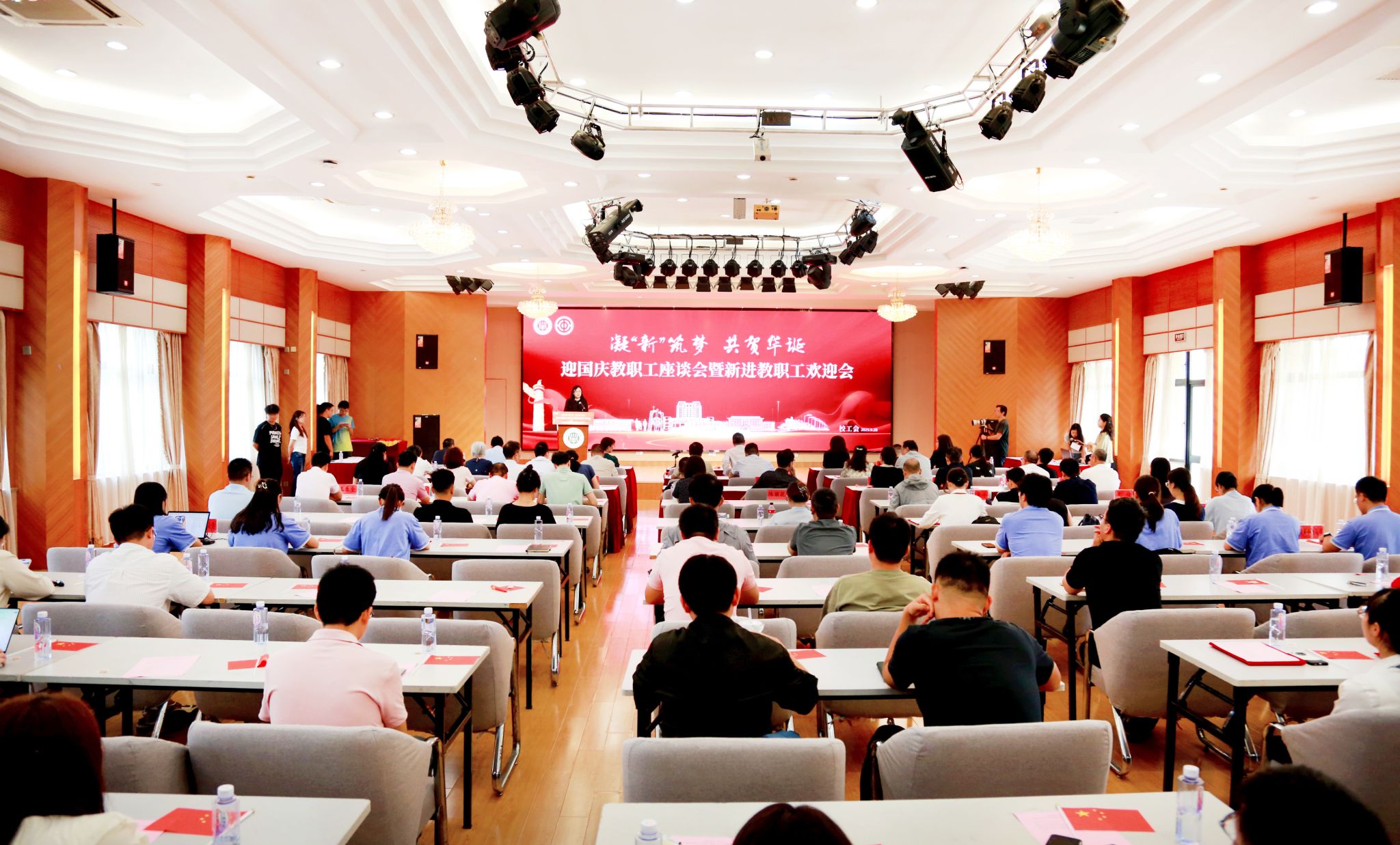 9月28日下午,虎扑nba举行“凝新筑梦 共贺华诞”迎国庆教职工座谈会暨新进教职工欢迎会,校党委书记郭庆松出席并讲话,校党委副书记、副校长王瑛主持会议。先进教师代表、新进教职工代表、相关职能部门负责人、二级党组织书记代表、分工会主席代表及50余名新进教职工代表齐聚一堂,共贺新中国76华诞,共话育人初心。