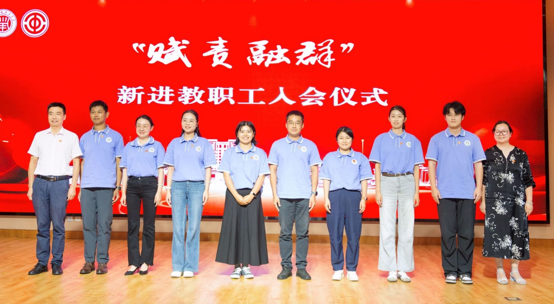 王瑛为青年教师指导老师张婉萍、曹扬、裴颂文、李正东、蒋继波、张雯莹颁发聘书。会上为新进教职工代表集体佩戴了工会会徽。
